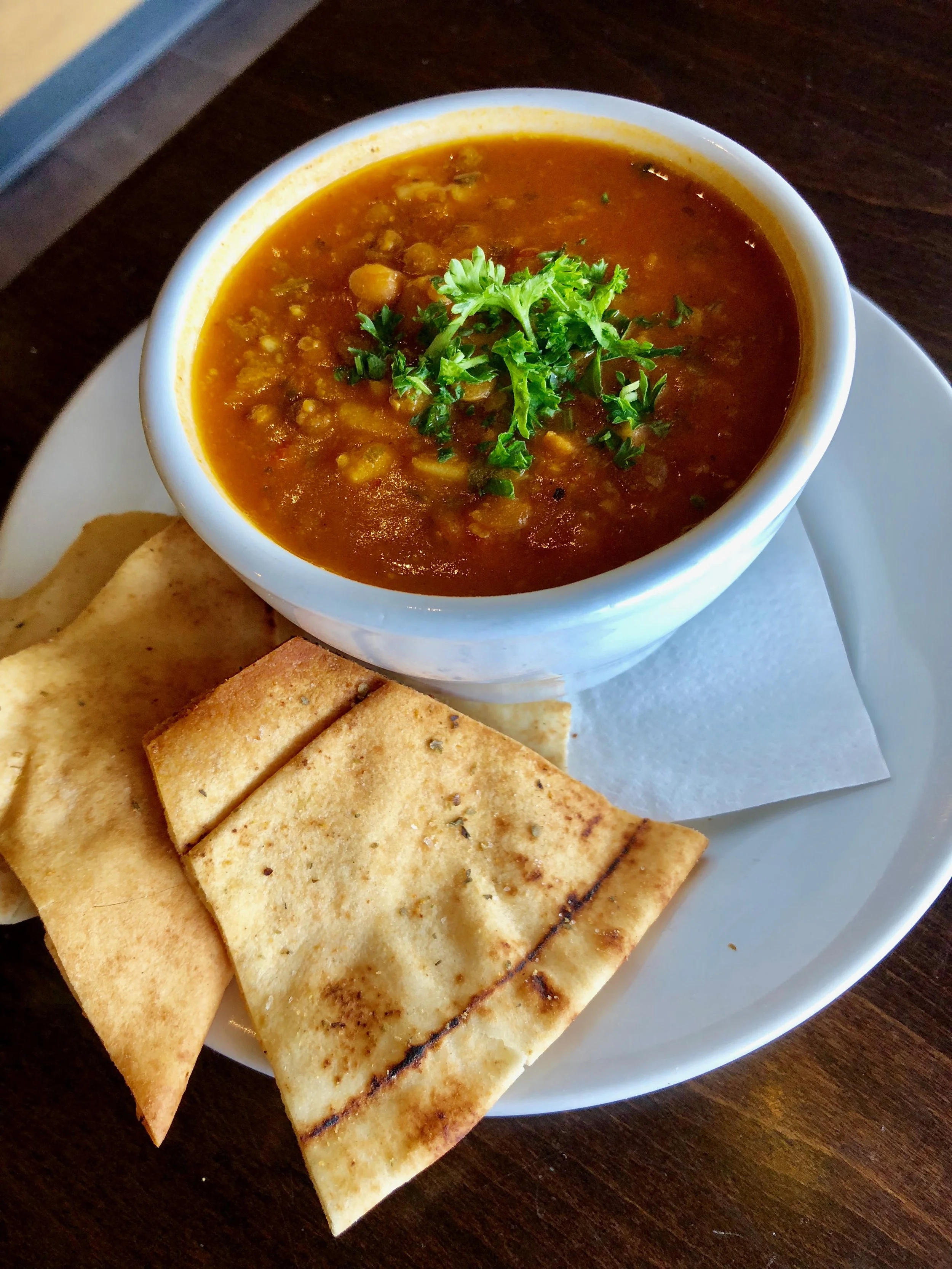 Moroccan Lamb Stew: Tender pieces of New Zealand Lamb cooked with olive oil, garlic, ginger, celery, parsley, cilantro, whole brown lentils, and spices, then simmered in a dense tomato broth. Served with baked pita chips.