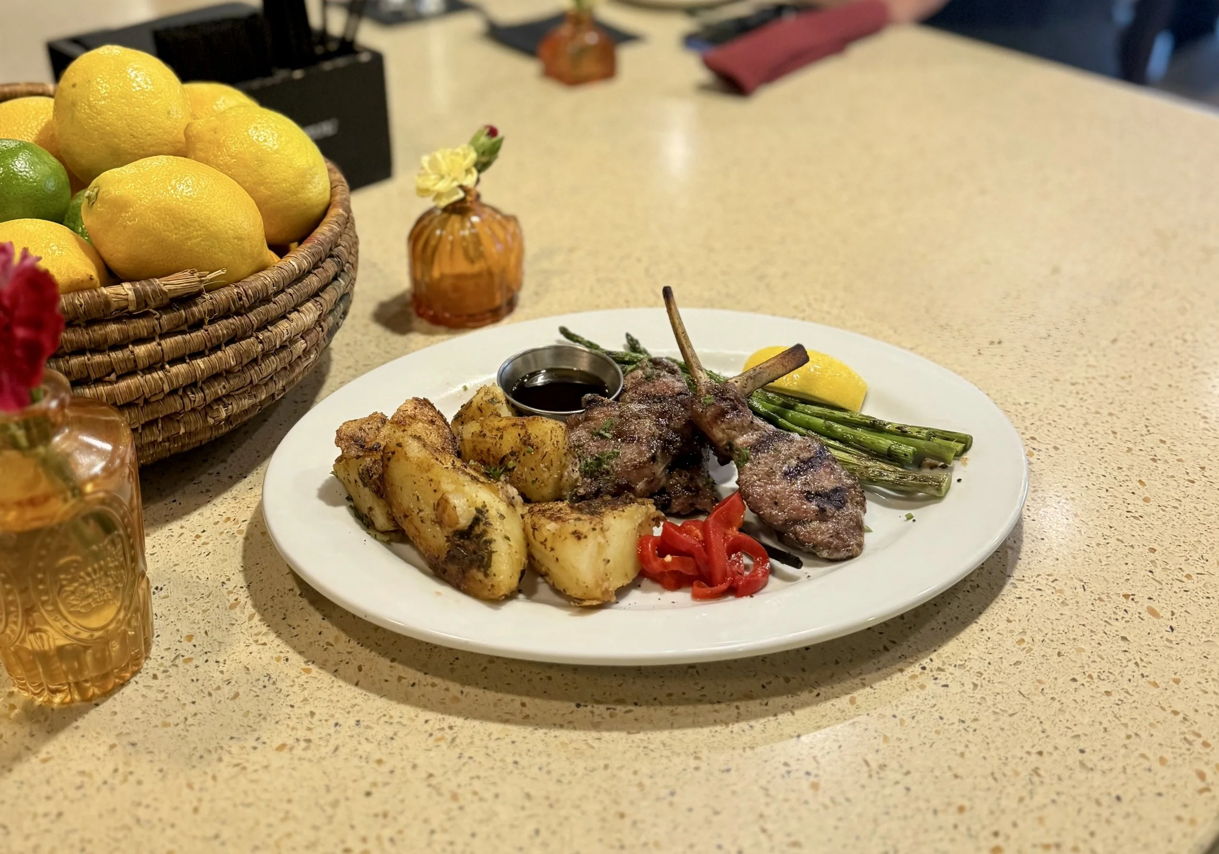 Chargrilled tender lamb chops marinated with olive, garlic, fresh herbs, and warm spices olive oil, served with rosemary smashed potatoes and grilled asparagus.
