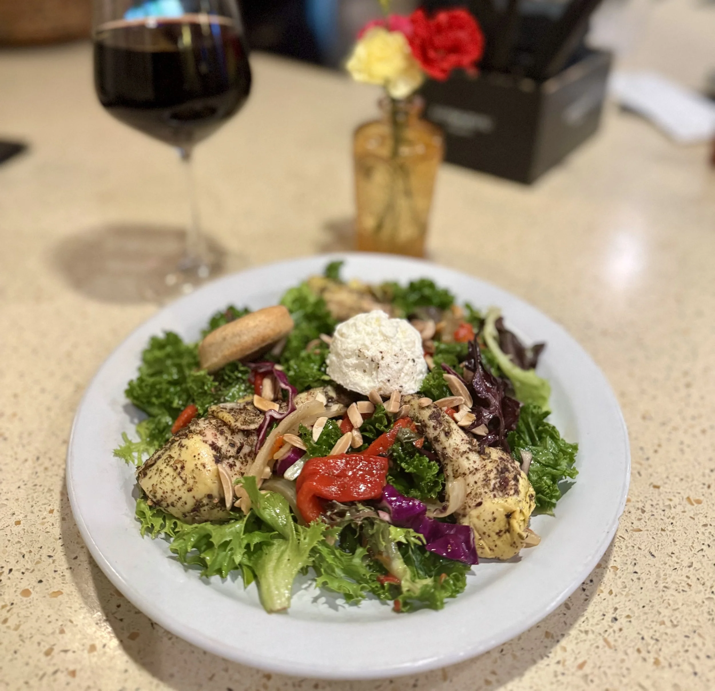 A delicious harmony of tender kale, mixed greens, shredded cabbage, roasted red pepper, caramelized onions, tossed in our Honey vinaigrette dressing and topped with imported stem artichokes, feta cheese, and toasted almonds.